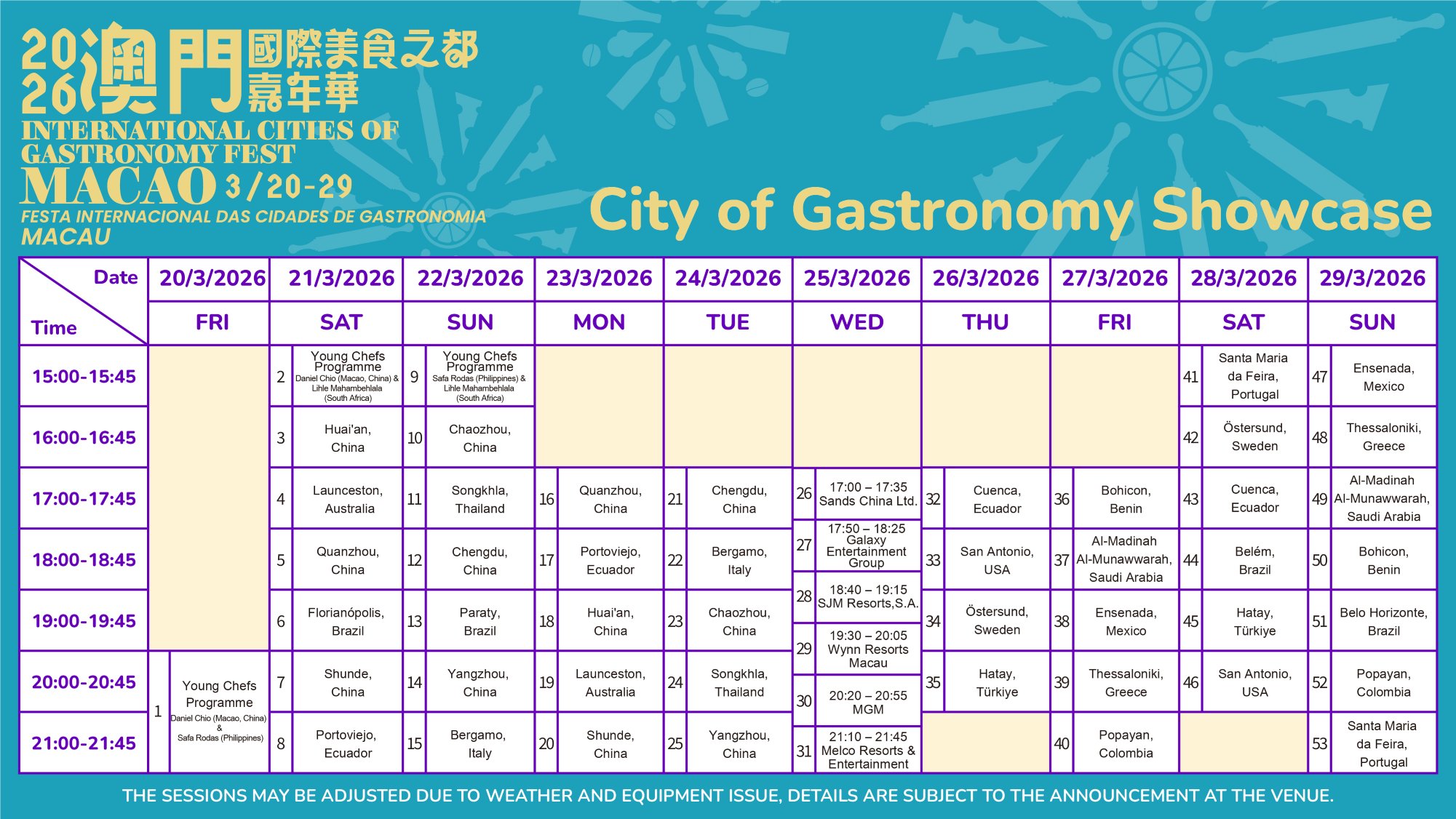 We are delighted to welcome 25 renowned chefs from UNESCO Creative Cities of Gastronomy for 53 spectacular live cooking demonstrations, where they will share their culinary secrets and celebrate the rich diversity of food cultures from around the globe.