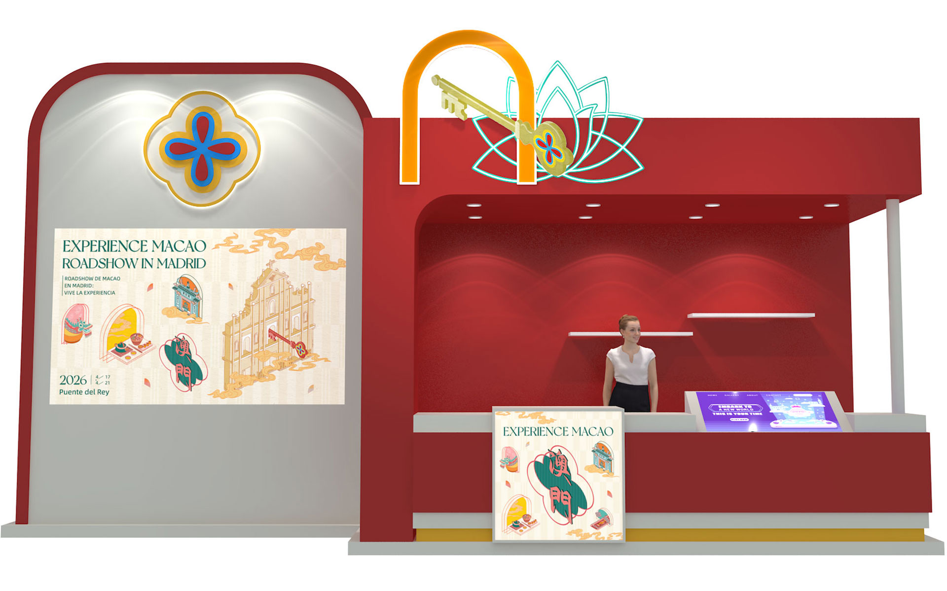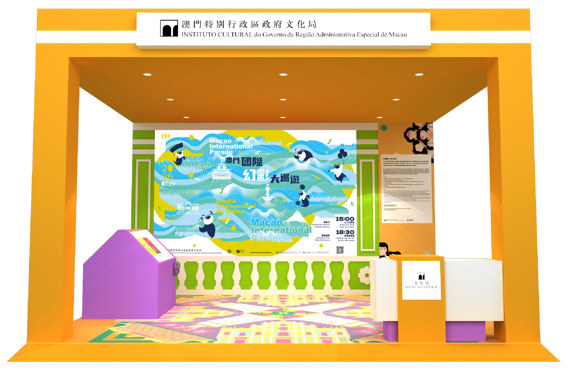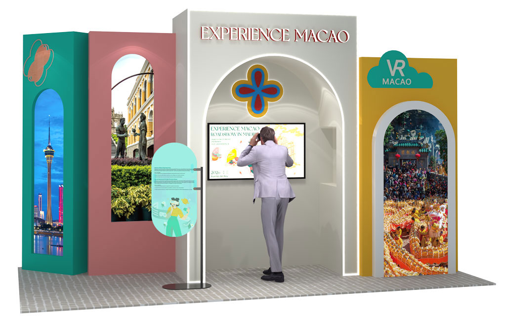 展位设计融合“中西共生”理念,区域规划分明,设有主舞台及表演区、多个政府部门展示区,以及丰富的中华文化体验区,生动展现澳门回归后的多元面貌与年度盛事。特色区域包括:“非遗舞狮展示区”、“澳门传统裙褂展示区”、“从太阳门到大三巴互动游戏区”、“澳门格兰披治大赛车体验区”及“云游澳门VR体验区”。透过互动体验,让访客感受澳门兼具东方传统与现代节奏的双重魅力,提升澳门作为旅游首选目的地的吸引力。