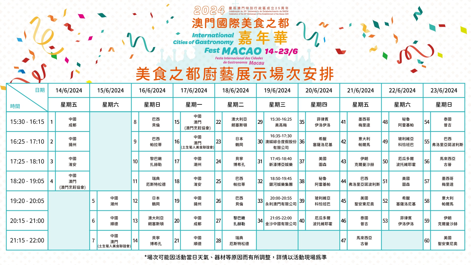 廚藝展示場次安排